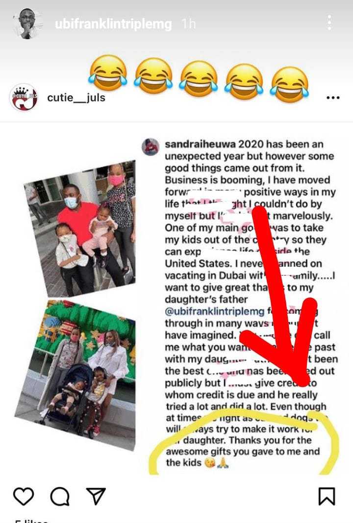 Ubi Franklin’s reactions comes after Sandra lheuwa had called him out for sharing a picture of their daughter on social media despite allegedly not taking responsibilities as a father.