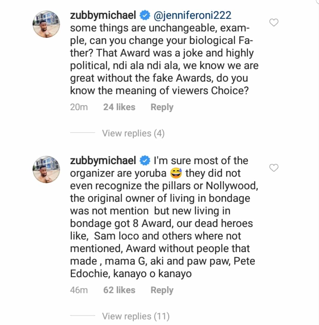 “I am sure most of the organizer are Yoruba. They did not even recognize the pillars or Nollywood, the original owner of loving in Bondage was not mention but new living in Bondage got 8 awards, our dead heroes like Sam Loco and others where not mentioned, Award without people that made Mama G, Ski and Paw paw, Pete Edochie, Kanayo O Kanayo”, he wrote.