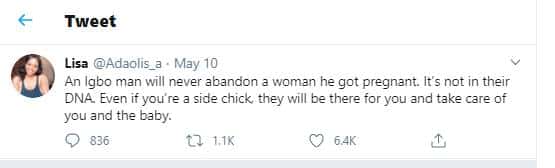 A Nigerian lady with the handle, @Adaolis_a on Twitter, has stated that an Igbo man will never abandon a woman he got pregnant, adding that it is not in their DNA.