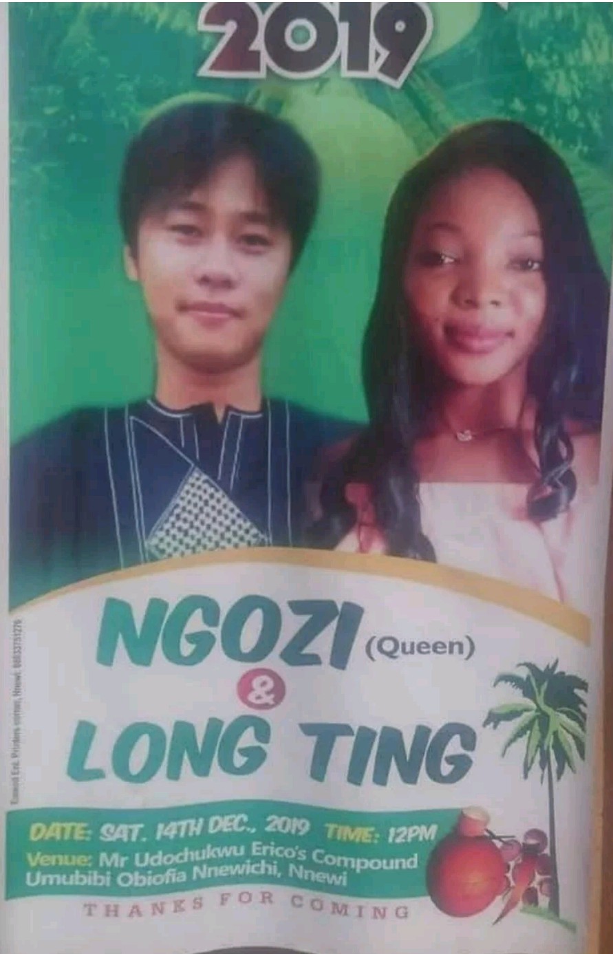 An Anambra lady identified as Ngozi recently tied the nuptial knots with her Asian heartrob, Mr Long Ting.