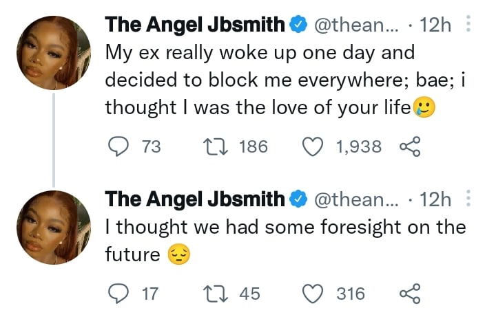 According to Angel, she once had the perception of being loved and wanted by this person until she woke up one morning and found out he blocked her across all social media networks.