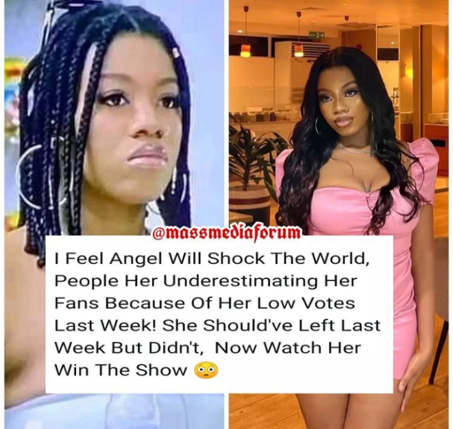 “I feel Angel will shock the world. People are underestimating her fans because of low votes last week. She should have left last week but she didn’t, now watch her win the show”, she wrote.