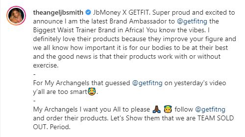 “JbMoney X GETFIT. Super proud and excited to announce I am the latest Brand Ambassador to @getfitng the Biggest Waist Trainer Brand in Africa! You know the vibes. I definitely love their products because they improve your figure and we all know how important it is for our bodies to be at their best and the good news is that their products work with or without exercise.
