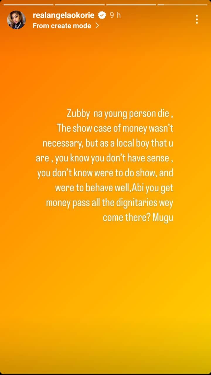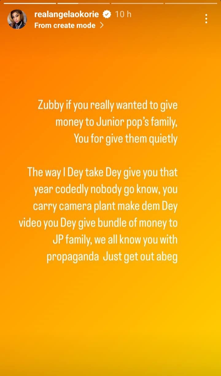 Angela Okorie, who has been dragging Zubby and laying accusations on him following the demise of Junior Pope, found this to be inappropriate.