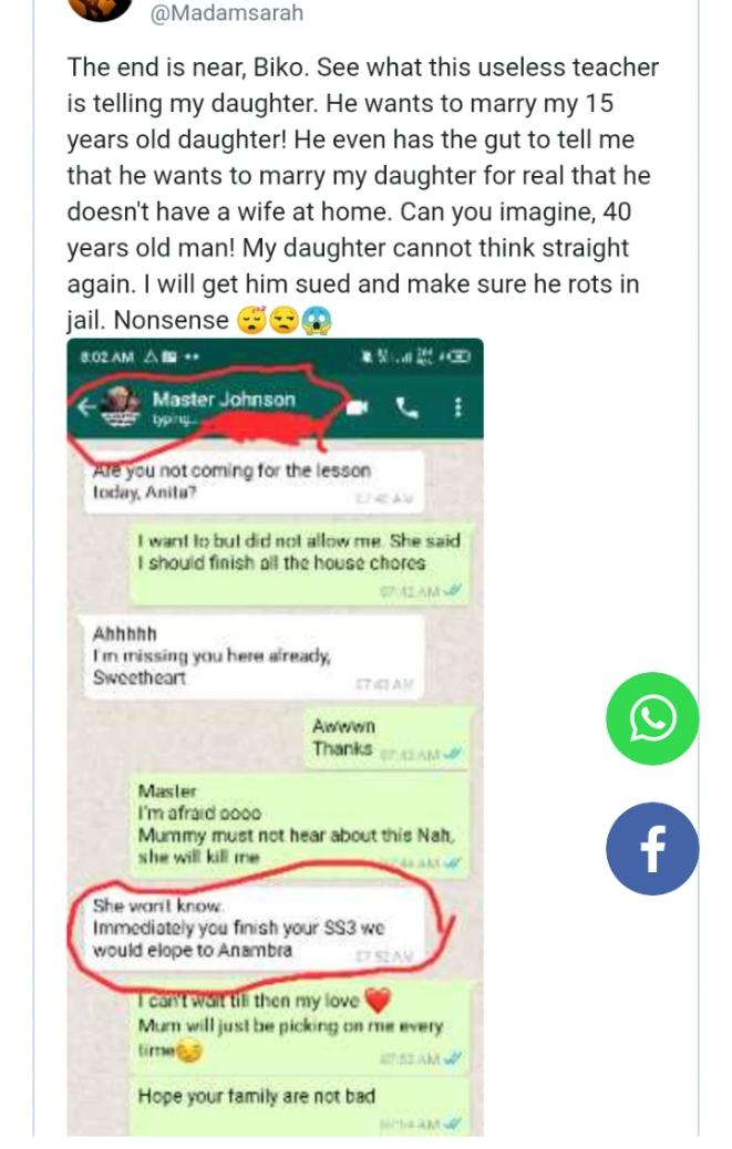 “The end is near biko, see what this useless teacher is telling my 15-year-old daughter. He wants to marry my 15 years old daughter”, her mother wrote.