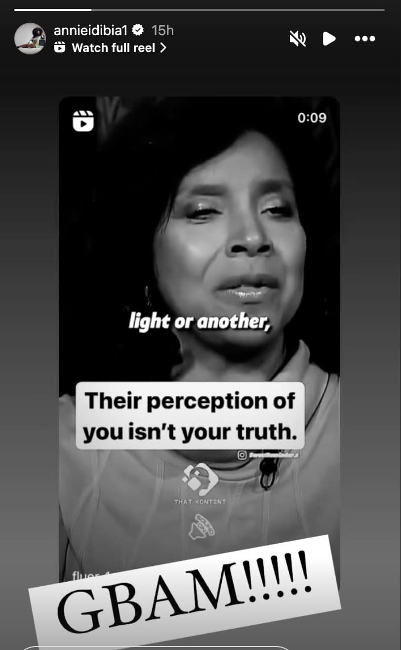 In what appears to be a response, Annie Idibia posted a video on her Instagram page featuring a motivational quote.