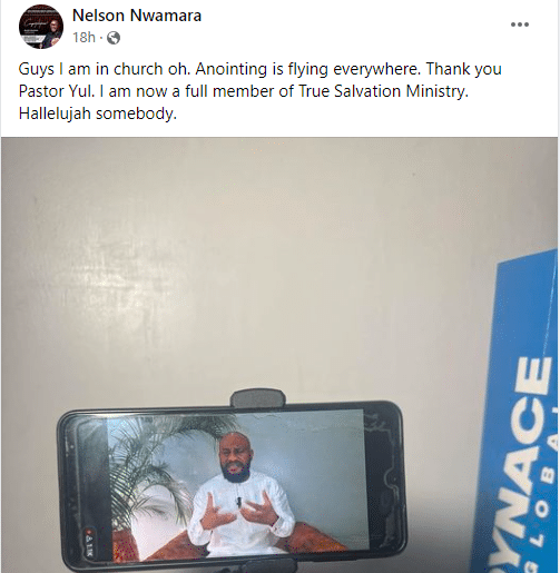 “Guys I am in church oh. Anointing is flying everywhere. Thank you Pastor Yul. I am now a full member of True Salvation Ministry. Hallelujah somebody.”