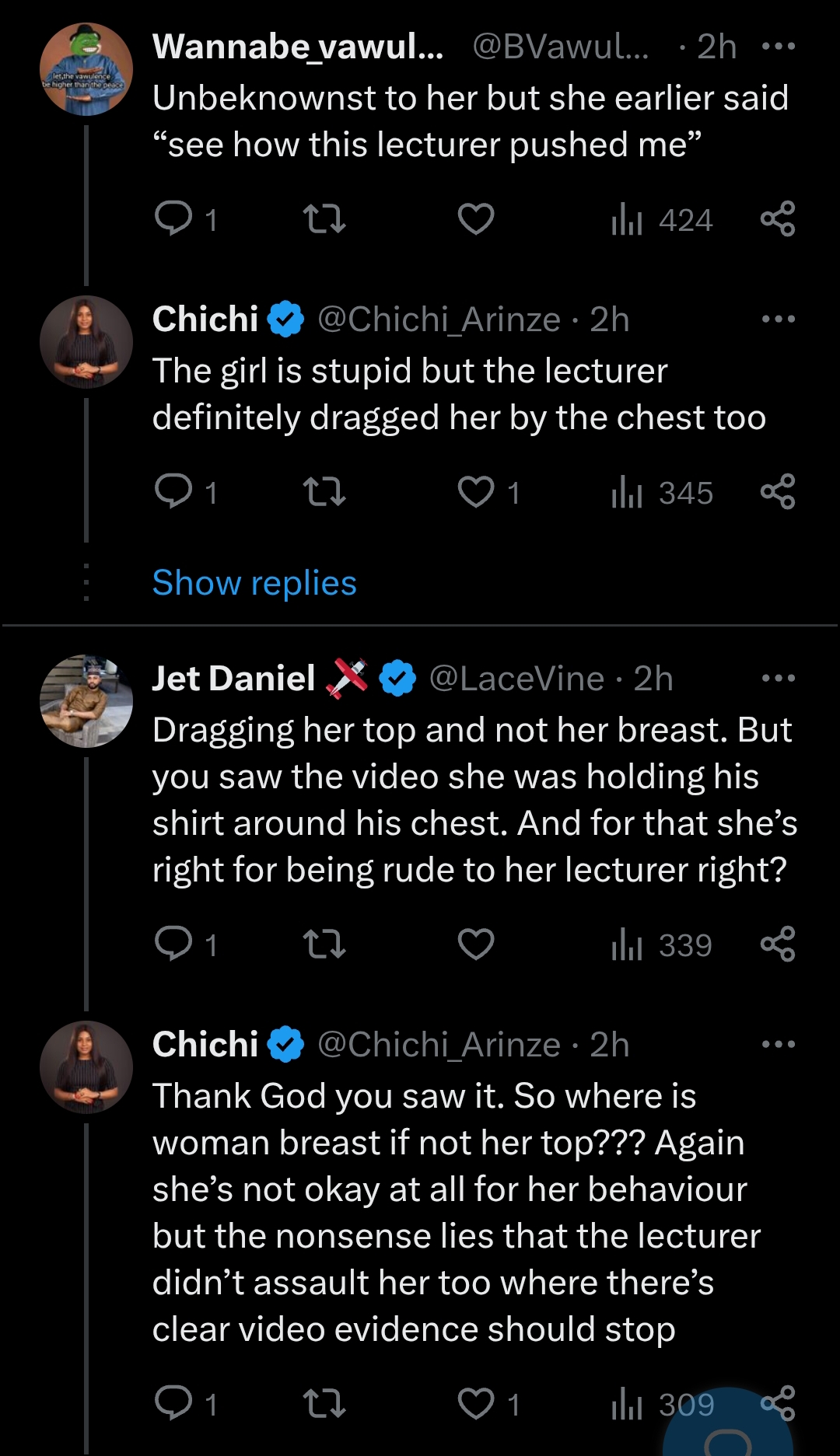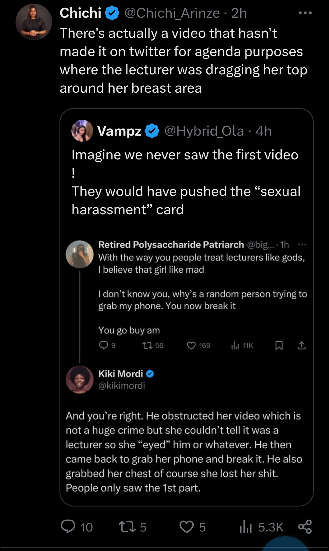 @LaceVine: “Dragging her top and not her breast. But you saw the video she was holding his shirt around his chest. And for that she’s right for being rude to her lecturer right?”