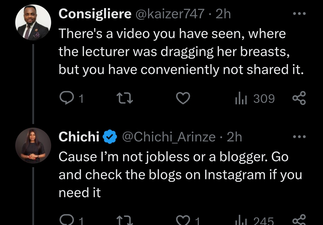 @kaizer747: “There’s a video you have seen, where the lecturer was dragging her breasts, but you have conveniently not shared it.