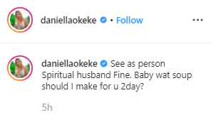 “See as person Spiritually husband Fine. Baby wat soup should I make for u 2day?”
