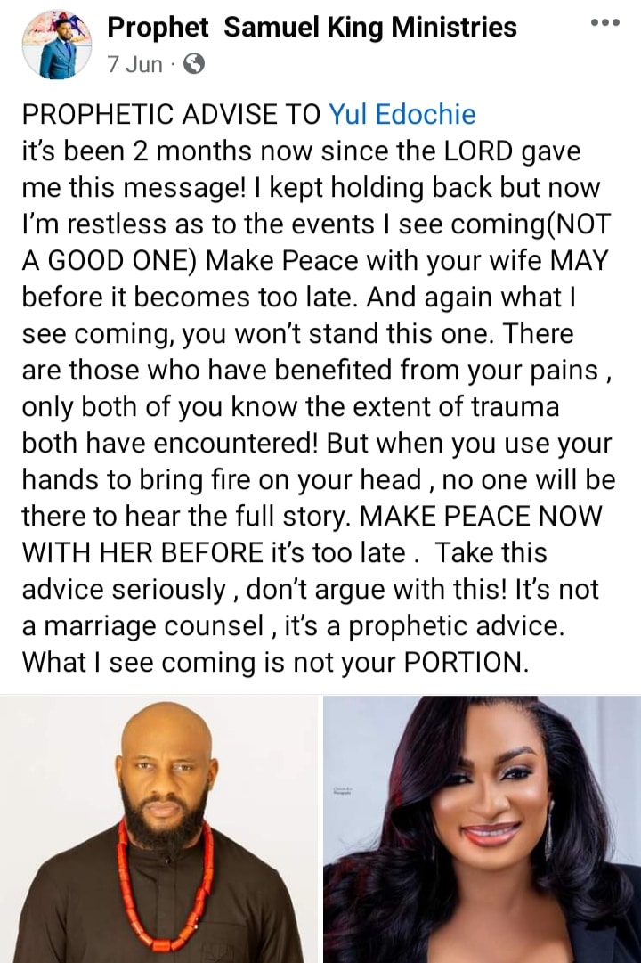 Prophet stirs worry as he predicts doom for popular actor and pastor Yul Edochie, while advising him to make peace with his estranged wife, May Edochie.