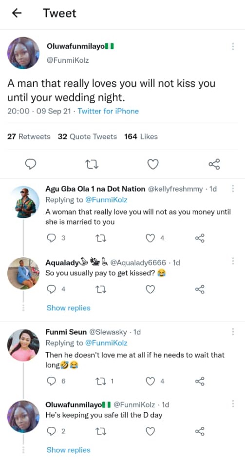 In a tweet shared on her official Twitter page, Funmi told ladies that if any man truly loves them, then that man will not attempt a kiss until they’re fully married as husband and wife.