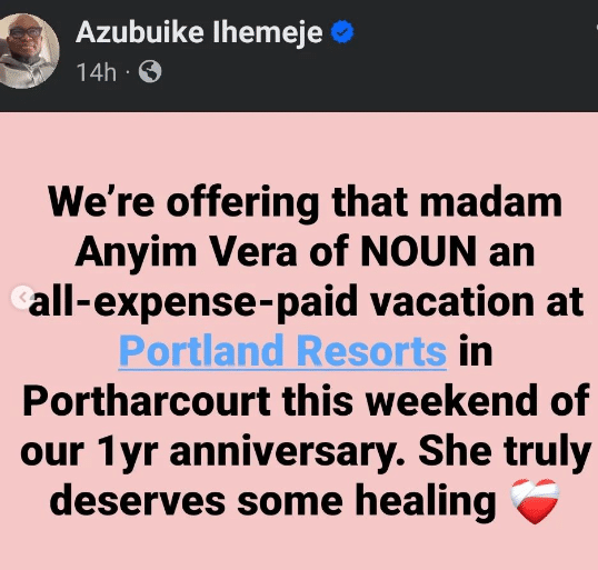 “We’re offering that madam Anyim Vera of NOUN an all-expense-paid vacation at Portland Resorts in Portharcourt this weekend of our lyr anniversary. She truly deserves some healing”