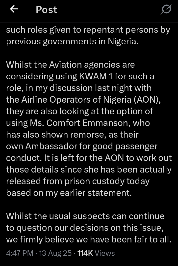 According to a statement released by the Minister of Aviation and Aerospace, Festus Keyamo, on X (formely Twitter), AON is considering appointing Comfort Emmanson as an ambassador for good passenger conduct.