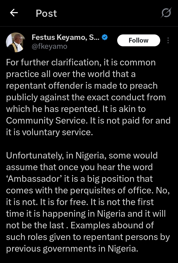Festus Keyamo addressed the controversy surrounding K1 De Ultimate’s appointment as aviation ambassador, stating that the singer’s role would be voluntary with no payment.