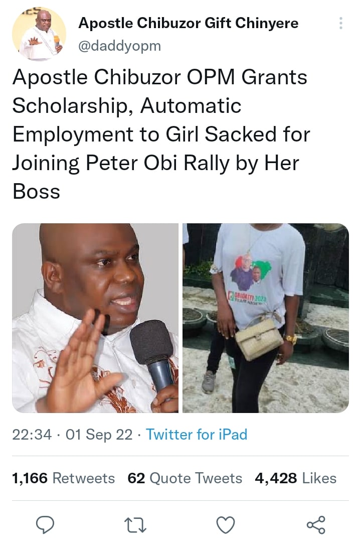 “Apostle Chibuzor OPM Grants Scholarship, Automatic Employment to Girl Sacked for Joining Peter Obi Rally by Her Boss”.