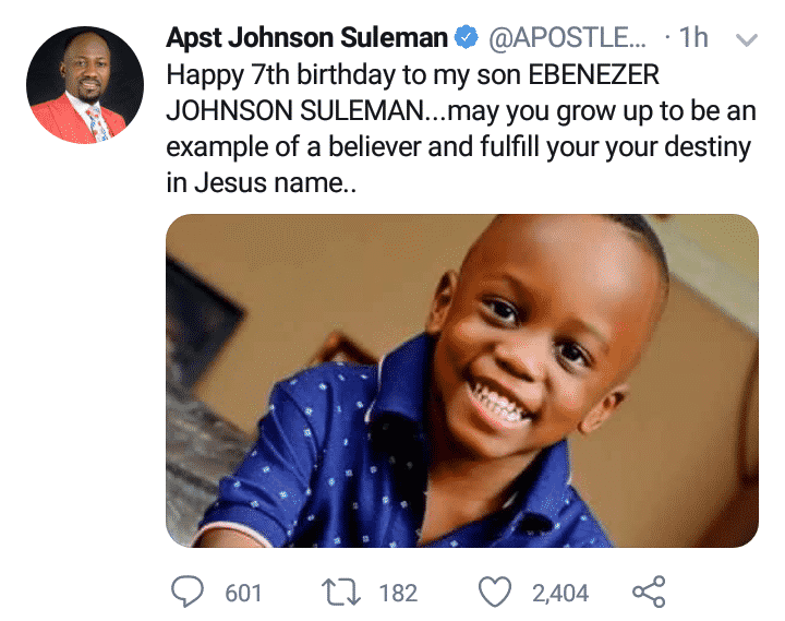 Popular Nigerian televangelist and General Overseer of Omega Fire Ministries International, Apostle Johnson Suleman has taken to social media to celebrate his son, Ebenezer Johnson-Suleman on his 7th birthday today.