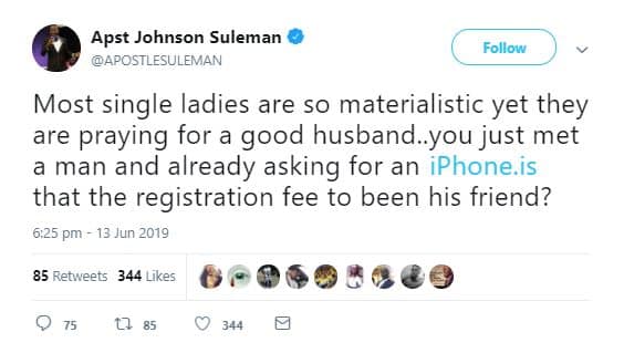 “Most single ladies are so materialistic yet they are praying for a good husband..you just met a man and already asking for an iPhone. Is that the registration fee to been his friend?”.