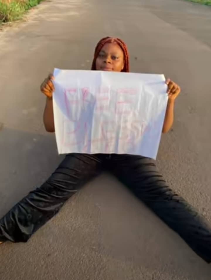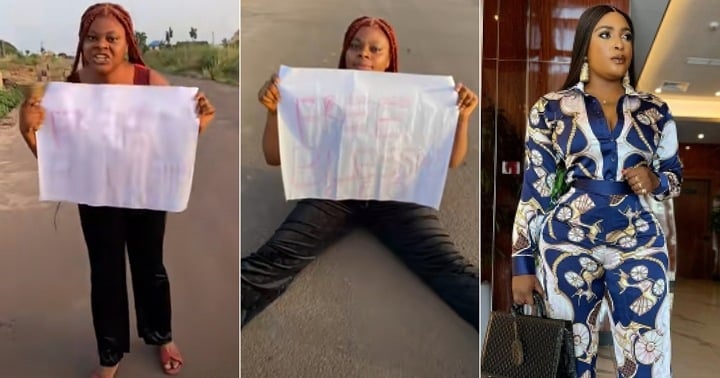 In a trending video, the lady held a white placard and begged the Nigerian police to release the self-acclaimed relationship expert.