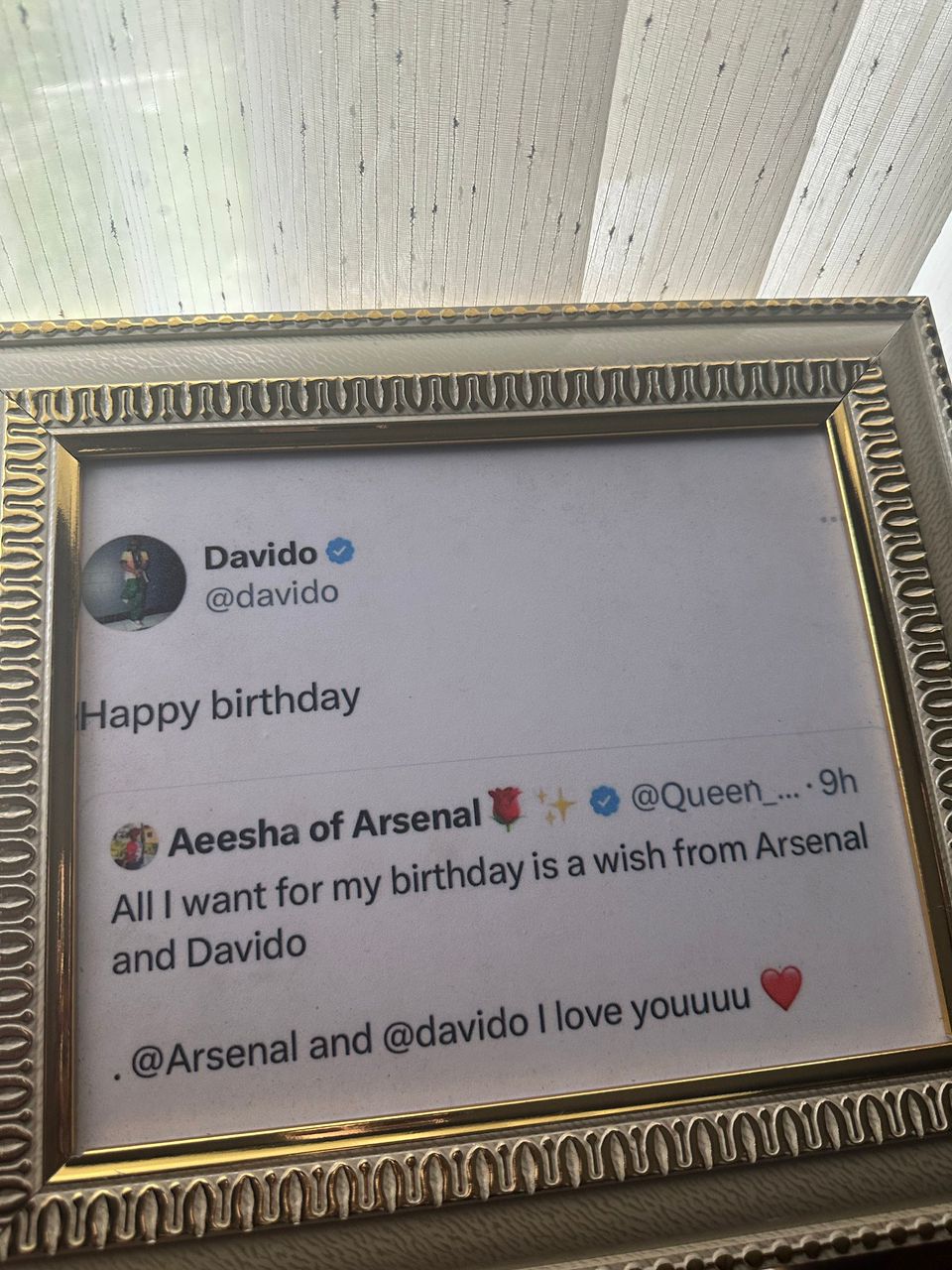 Arsenal fan frames ‘tweet’ as Davido makes her birthday wish come true
