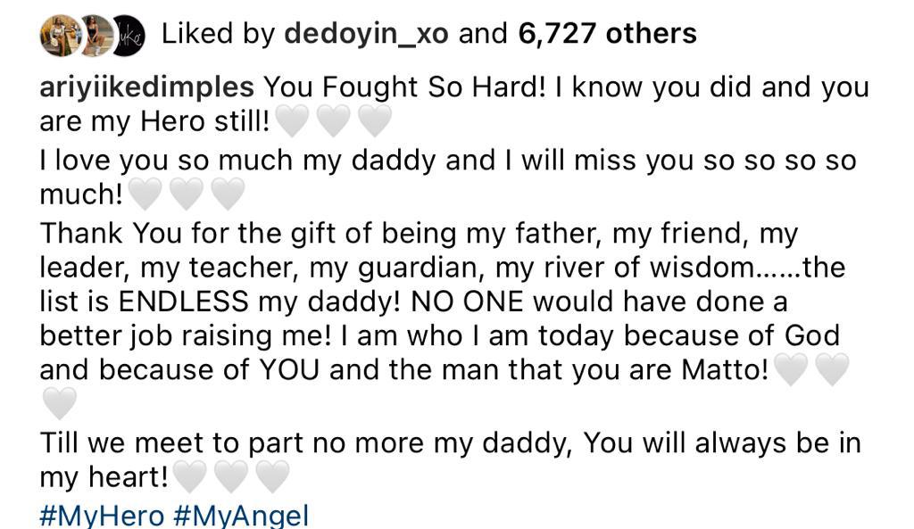 According to Ariyike, her father fought so hard for his life but above all, she’s thankful for all he did for her until his death.