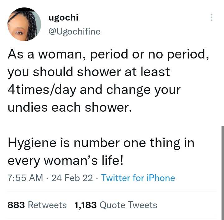 The lady identified with the Twitter handle@ugochifine took to the microblogging platform to assert that ladies should take their bath four times a day.