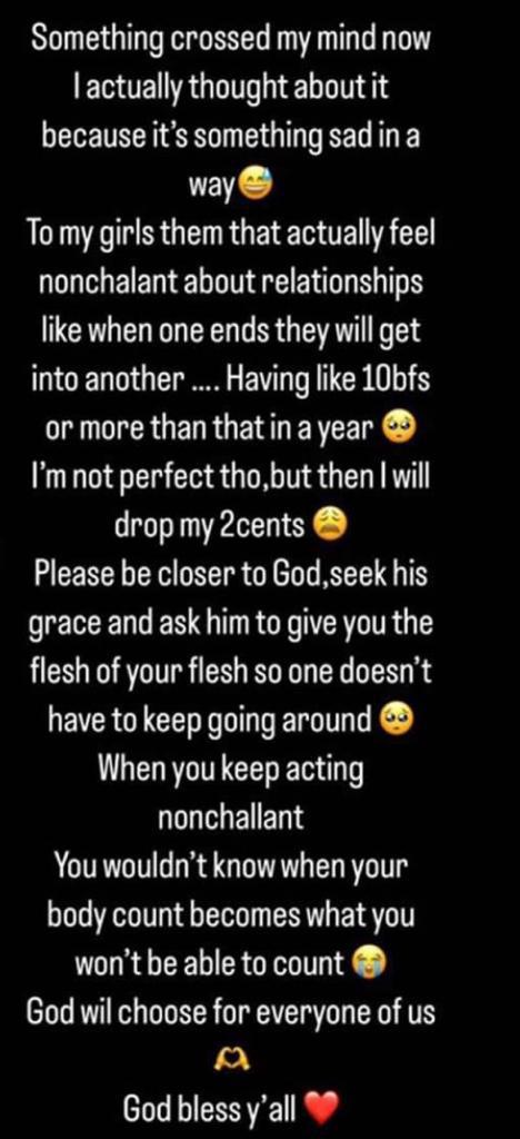 “Something crossed my mind now I actually thought about it because it’s something sad in a way g To my girls them that actually feel nonchalant about relationships like when one ends they will get into another ….