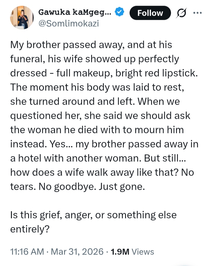The story, shared by a social media user identified as @Somlimokazi, revealed that the deceased man’s wife appeared at the funeral well-dressed, wearing full makeup and bright red lipstick.
