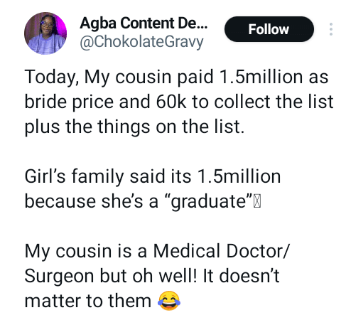 “Today, my cousin paid 1.5 million as bride price and 60k to collect the list plus the things on the list. The girl’s family said it’s 1.5 million because she’s a ‘graduate.’ My cousin is a Medical Doctor/Surgeon, but oh well! It doesn’t matter to them,” the post read.