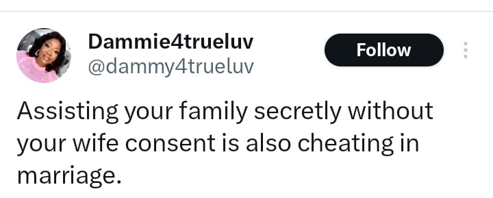 “Assisting your family secretly without your wife’s consent is cheating” – Lady argues, Nigerians react