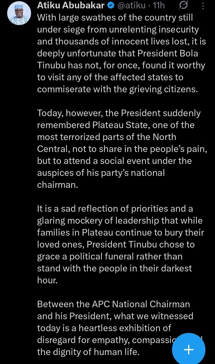 Atiku blasts Tinubu for visiting Plateau to “merry” instead of consoling insecurity victims