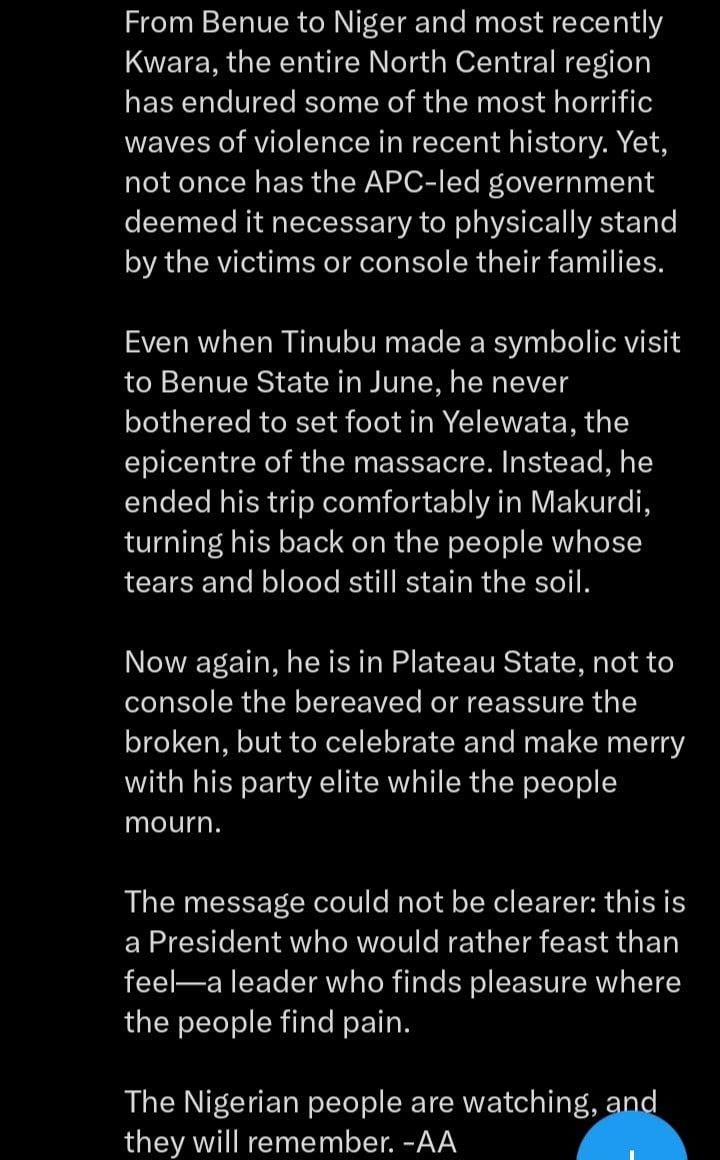 It is a sad reflection of priorities and a glaring mockery of leadership that while families in Plateau continue to bury their loved ones, President Tinubu chose to grace a political funeral rather than stand with the people in their darkest hour.