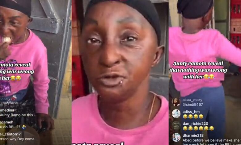 Debunking the claims, Aunty Ramota, in a fresh video, shows off her full body, revealing it is intact and adding that there’s nothing wrong with her.