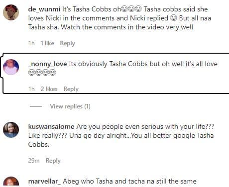 The American gospel singer, Tasha Cobbs Leonard and reality star, Natacha Akide visibly left comments on Nicki’s video and in response, Nicki Minaj professed love for Tasha/Tacha.