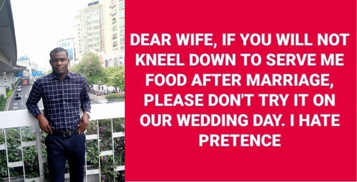 Nigerian man cautions his future wife on kneeling to serve him food