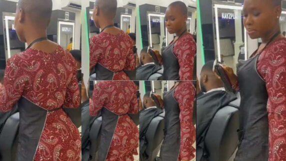 “U dey do home service abeg?” – Reactions as curvy lady barber whines waist as she trims customer’s hair (Video)