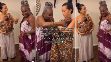 Video of Nigerian woman teaching oyinbo daughter-in-law traditional baby wrap technique