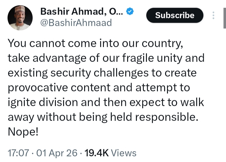 “A reliable source has informed me that the hate monger, Mr. Alex Barbir, has been ordered by the authorities to leave this country. Since arriving in Nigeria, he has been attempting to ignite religious tensions, particularly in communities he visited across the North Central region. Our nation’s peace and unity must never be compromised and anyone found promoting division should be held accountable.You cannot come into our country, take advantage of our fragile unity and existing security challenges to create provocative content and attempt to ignite division and then expect to walk away without being held responsible. Nope!”