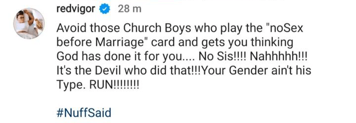 “Avoid those Church Boys who play the “no Sex before Marriage” card and gets you thinking God has done it for you…. No Sis!!! Nahhhhhi!!! It’s the Devil who did that!!! Your Gender aint his Type. Run.”