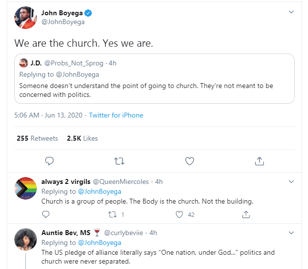 John Boyega replied by tweeting “We are the church. Yes we are.”