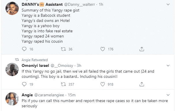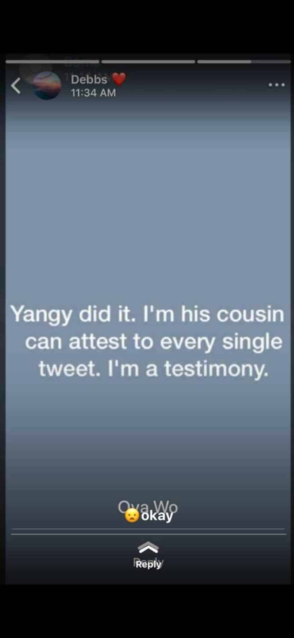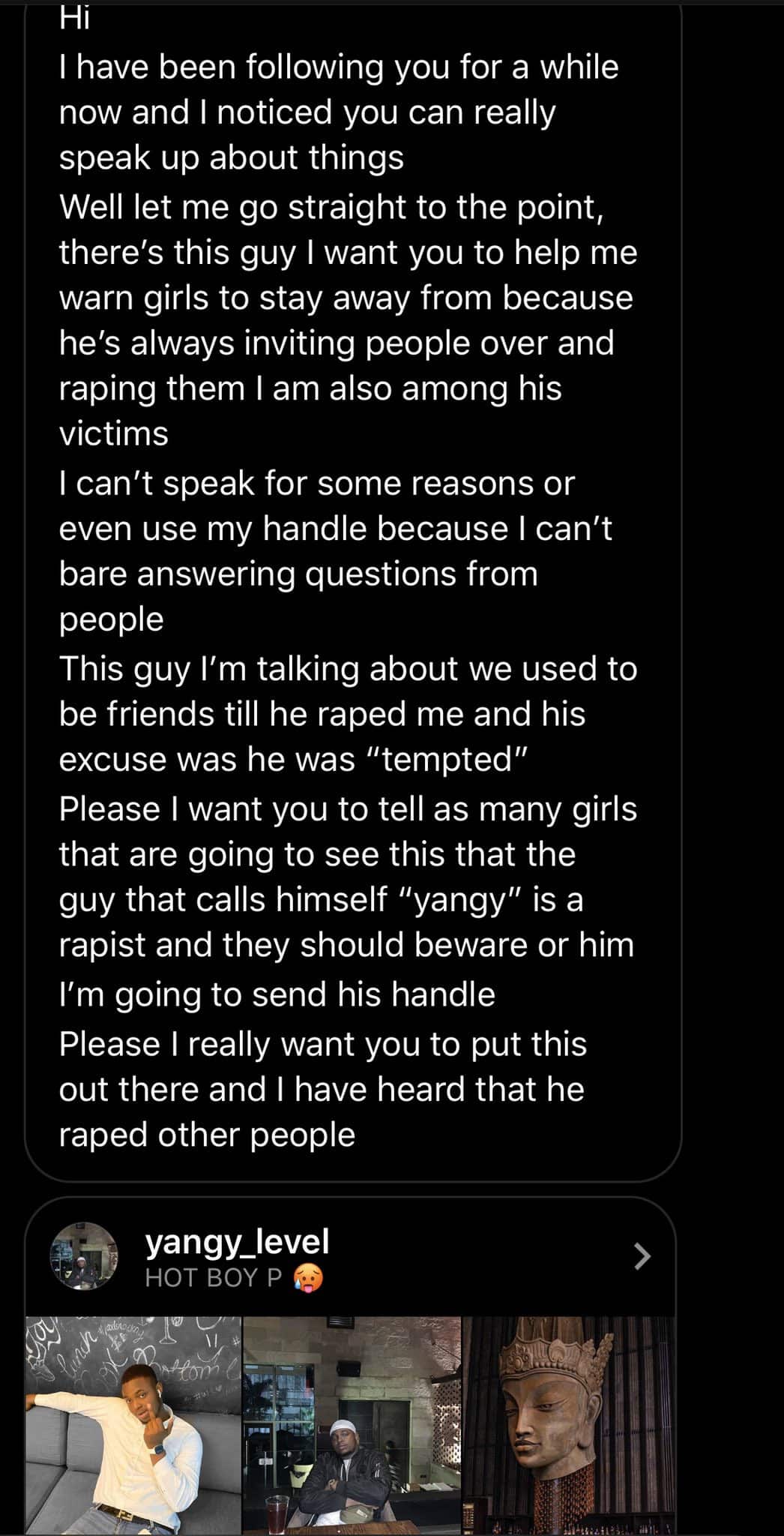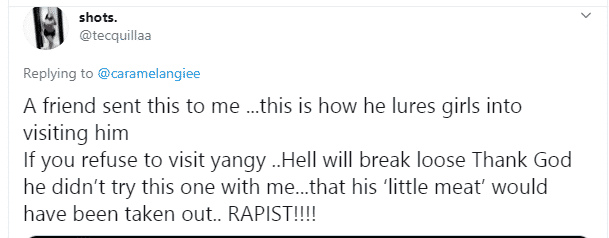 A lady who claimed to be Yangy’s cousin, also accused him of raping her. She wrote;