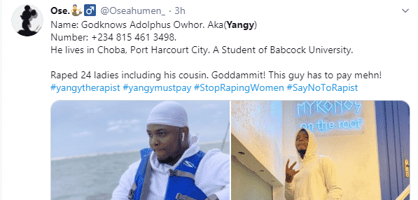 A Babcock student, identified as Godknows Adolphus Owhor is currently trending on Twitter after he was accused of rape.