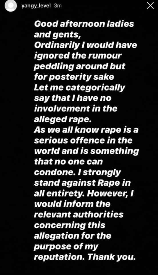 Yangy who however denied the rape allegation and also promised to bring in relevant authorities into the rape case.