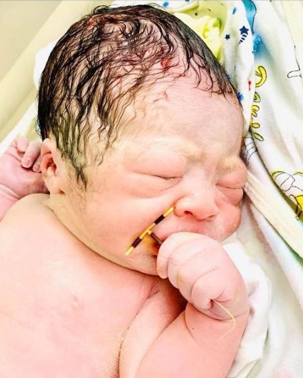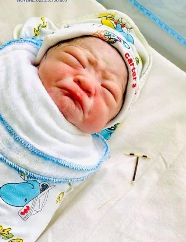The baby boy can be apparently be seen clasping his mother’s yellow and black intrauterine device in his hand at Hai Phong International Hospital in the city of Hai Phong in northern Vietnam.