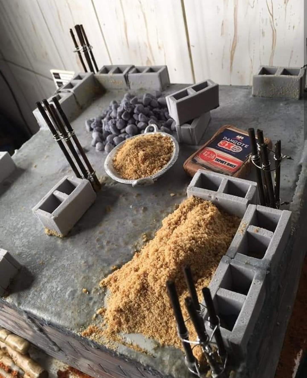 From the photos shared, the cake was designed to look like an uncompleted building. A close look at the cake shows a head pan, a trip of sand, blocks and some other materials which are usually present in an uncompleted building.