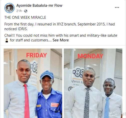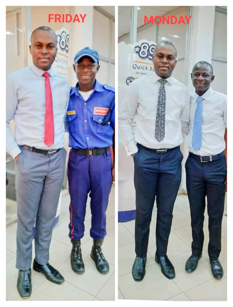 The picture showed us together on his last day as a security guard on FRIDAY and his First day inside the branch the following MONDAY.