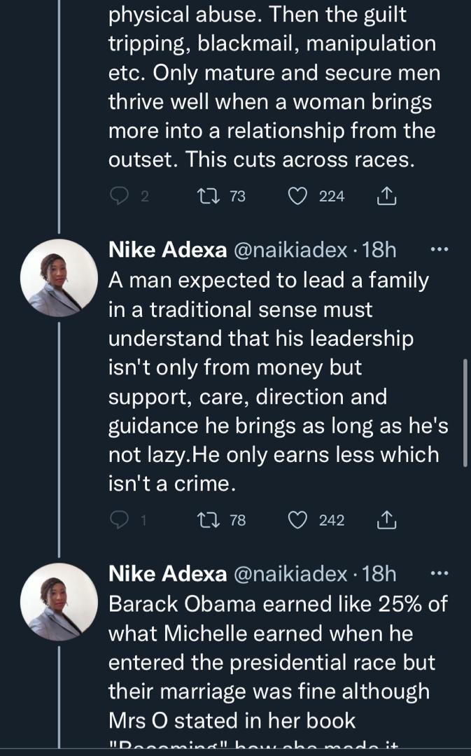 A man expected to lead a family in a traditional sense must understand that his leadership isn’t only from money but support, care, direction and guidance he brings as long as he’s not lazy. He only earns less which isn’t a crime.
