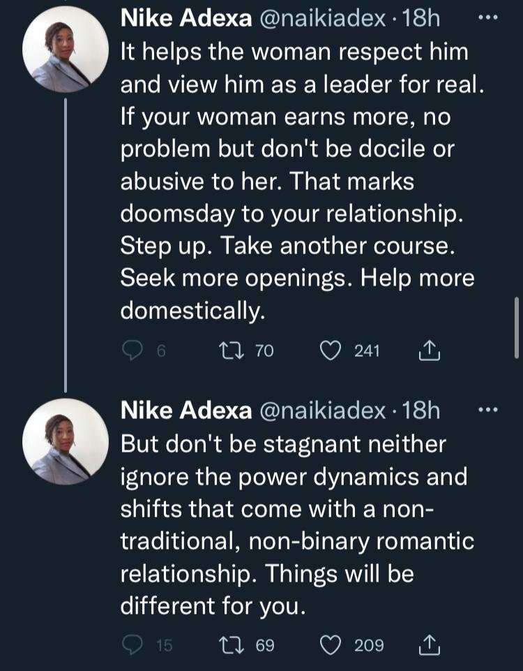 It helps the woman respect him and view him as a leader for real. If your woman earns more, no problem but don’t be docile or abusive to her. That marks doomsday to your relationship. Step up. Take another course. Seek more openings. Help more domestically.