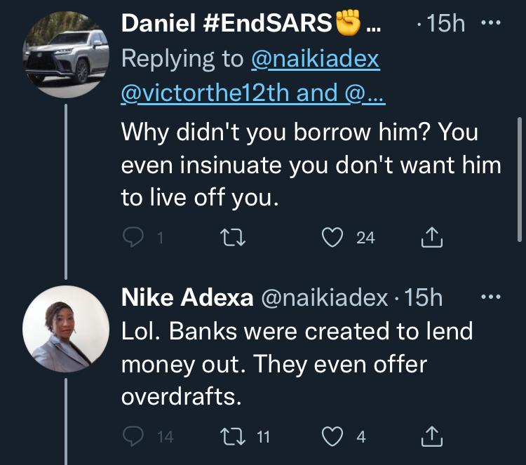 “Lol Banks were created to lend money out. They even offer overdrafts,” she responded.