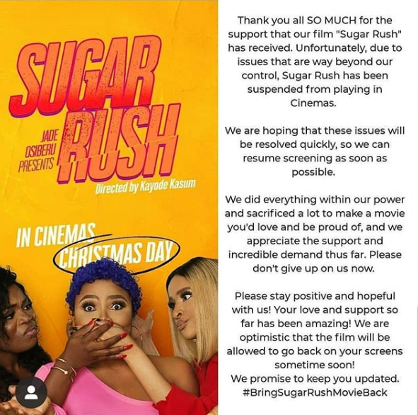 According to Banky W, ‘If you saw @sugarrushmovie and loved it, or if you planned to, please read our statements. We are very hopeful and optimistic that the film will be back on screens in a few days, so please don’t give up on us, and please stay optimistic with us.